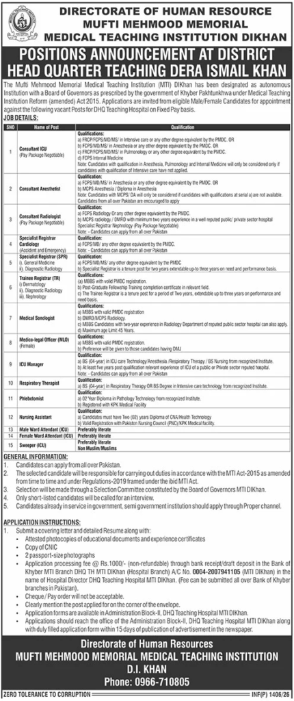 Both female and male candidates can apply for these District Headquarters Teaching Jobs 2026. Qualification /Experience Required: a) MBBS with valid PMDC registration. b) Preference will be given to those candidates having DMJ, a) BS (04-year) in ICU care Technology, Anesthesia /Respiratory Therapy/BS Nursing from a recognized Institute. b) At least five years post-qualification relevant experience in an ICU of a public or Private sector reputed hospital. Note: Candidates can apply from all over Pakistan, and more experienced candidates should apply within 15 days.