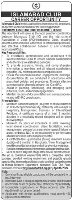 Candidates, if you are seeking the Islamabad Club Jobs 2026 Online Application, if yes. It would be best if you tried to complete reading this Islamabad Club Jobs because you can easily apply for this vacancy as an Executive Assistant.