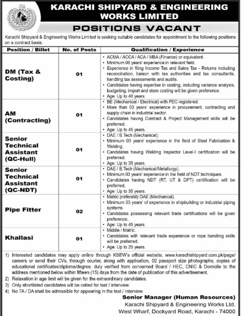 Candidates, if you are seeking Karachi Shipyard and Engineering Works Limited Jobs 2026, then yes. It would be best if you tried to complete reading this Karachi Shipyard and Engineering Works Limited Jobs because you can easily apply for these vacancies: DM (Tax & Costing), AM (Contracting), Senior Technical Assistant (QC-Hull), Senior Technical Assistant (QC-NDT), Pipe Fitter Khallasi.
