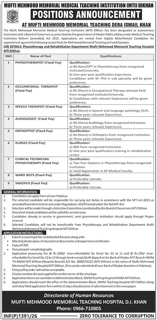 Candidates, if you are seeking the MTI DI Khan Jobs 2026, Apply Now / Latest Private Vacancies if yes. It would be best if you tried to complete reading this MTI DI Khan Jobs 2026 Apply Now / Latest Private Vacancies because you can easily apply for these vacancies: PHYSIOTHERAPIST (Fixed Pay), OCCUPATIONAL THERAPIST (Fixed Pay), SPEECH THERAPIST (Fixed Pay), AUDIOLOGIST (Fixed Pay), ORTHOPTIST (Fixed Pay), NURSES (Fixed Pay), CLINICAL TECHNICIAN PHYSIOTHERAPY (Fixed Pay), WARD BOYS (Fixed Pay), and SWEEPER (Fixed Pay).