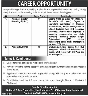 Candidates, if you are seeking the National Police Foundation Jobs 2026 April in Islamabad if yes. It would be best if you tried to complete reading this National Police Foundation Jobs 2026, as you can easily apply for these vacancies: Assistant Director, Marketing, and Assistant.