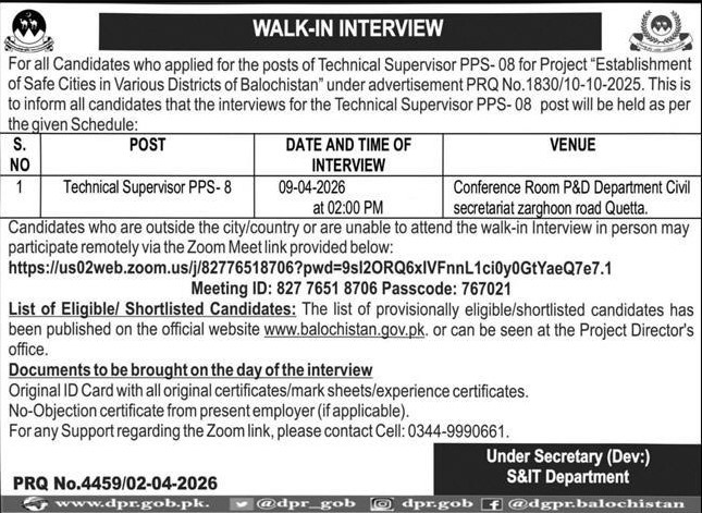 Candidates, if you are seeking the Technical Supervisor Jobs 2026 in Balochistan, Apply Online if yes. It would be best if you tried to complete reading this Technical Supervisor Jobs 2026 In Balochistan because you can easily apply for this vacancy, Technical Supervisor PPS-08.